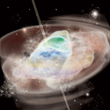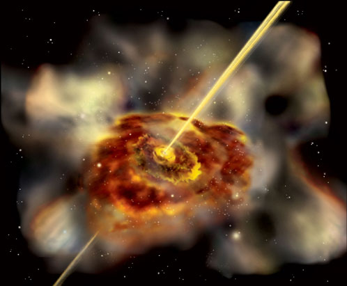 At the center of an active galaxy lies a monster: a supermassive black hole. As matter falls toward the hole, it forms a rotating, flattened disk called an accretion disk. Through processes still unknown, some black holes can form jets of matter and energy that stream outward. Active galactic nuclei, like the one depicted here in an artist’s illustration, are sites of gamma ray formation. Fermi will observe thousands of such sources.