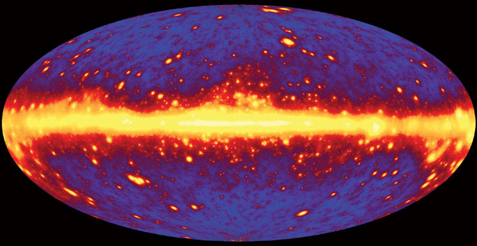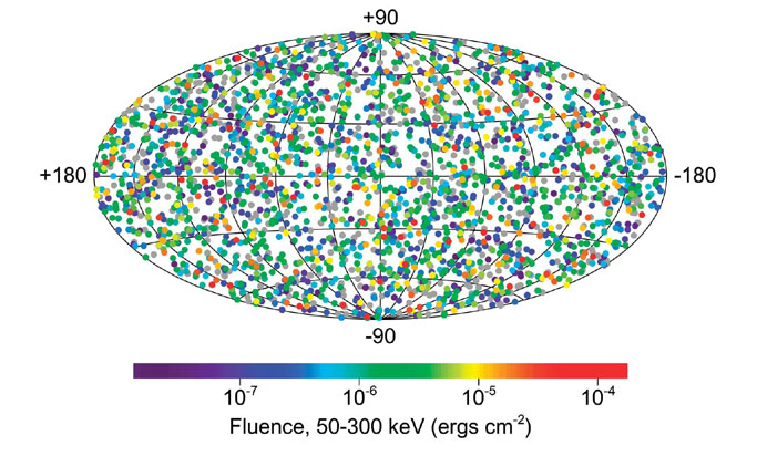 Every day, somewhere in the Universe, a black hole is born. Its birth is announced by the scream of a gamma ray burst, an event which may release as much energy in a millisecond as the Sun will in its entire life. GRBs can come from anywhere in the sky, as seen in this map made by the BATSE instrument onboard NASA’s Compton Gamma Ray Observatory.
